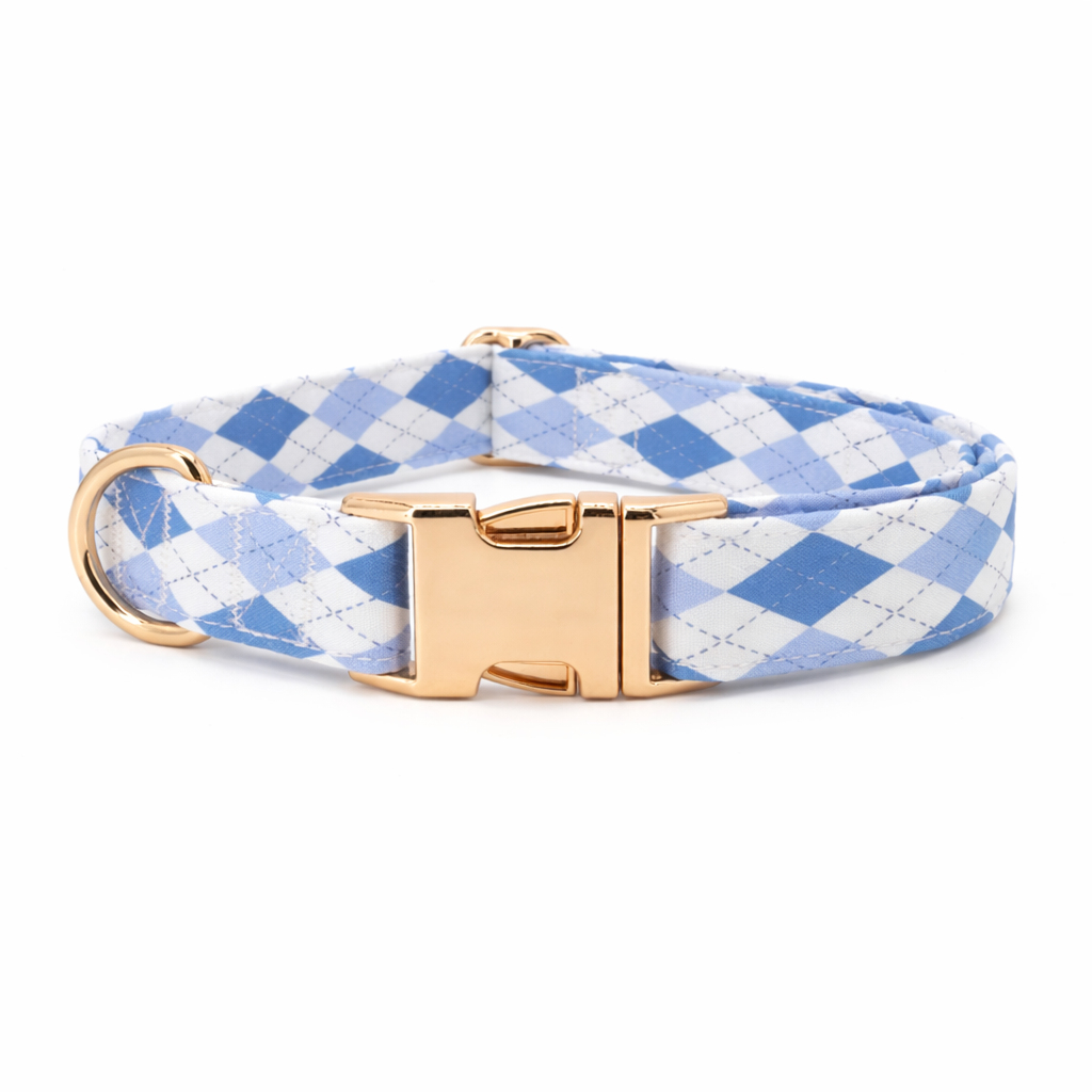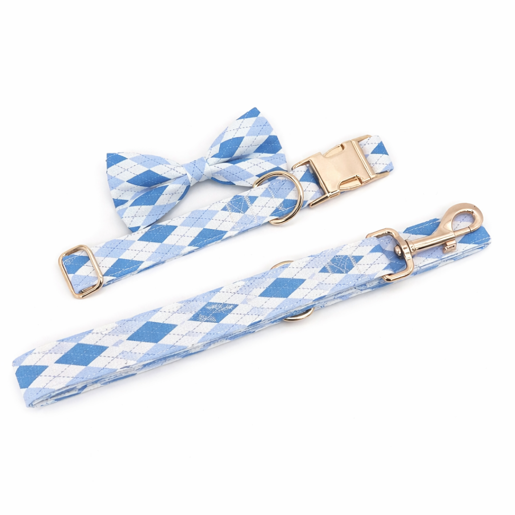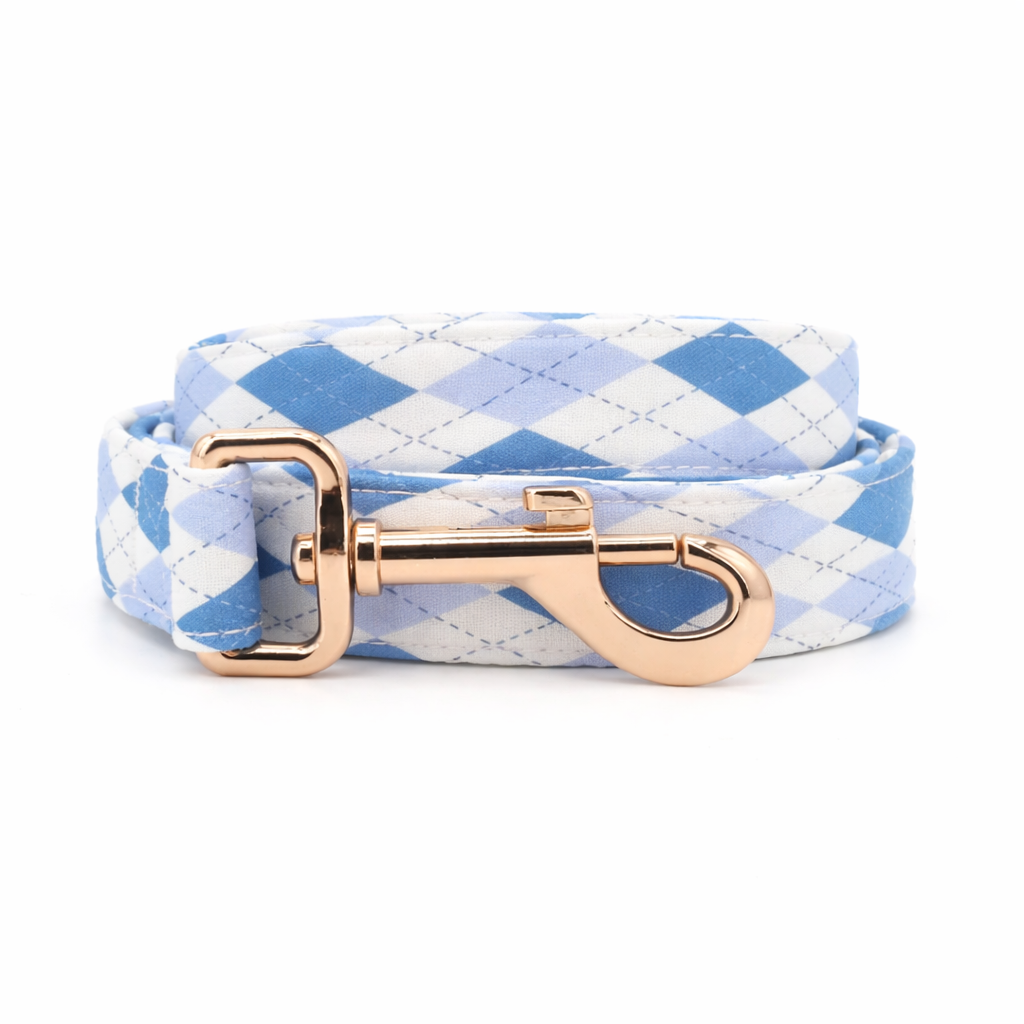 A refined collar and leash set featuring a fresh sky-blue argyle pattern.