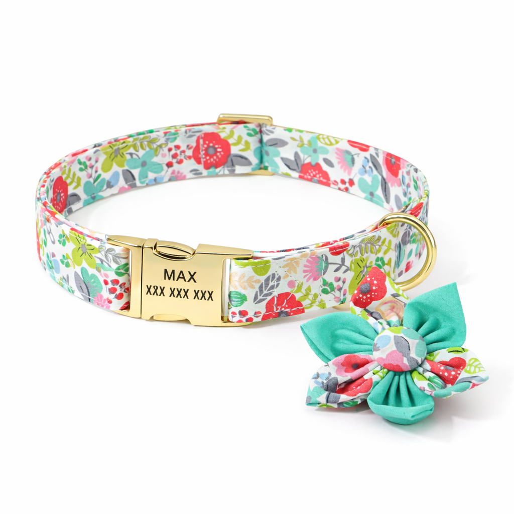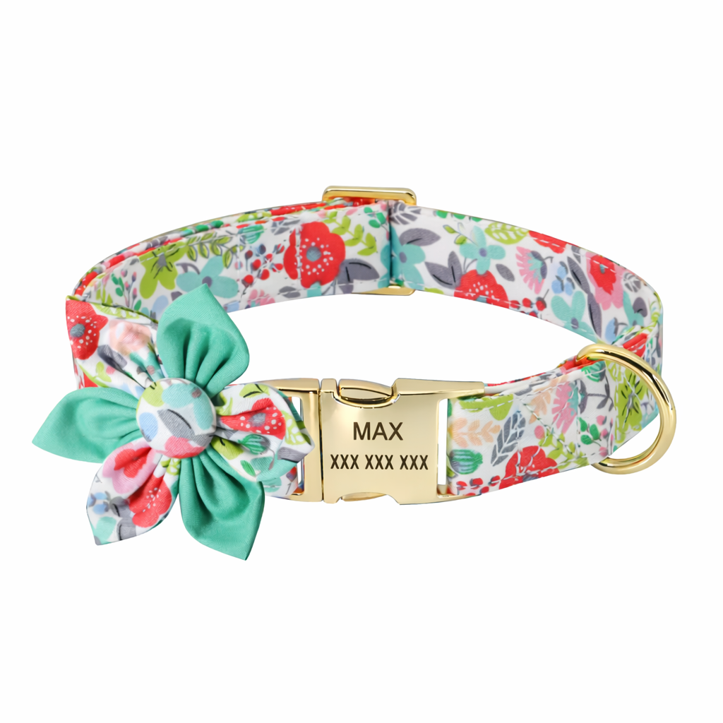 A refined collar and leash set featuring a vibrant floral print with an elegant flower accent.