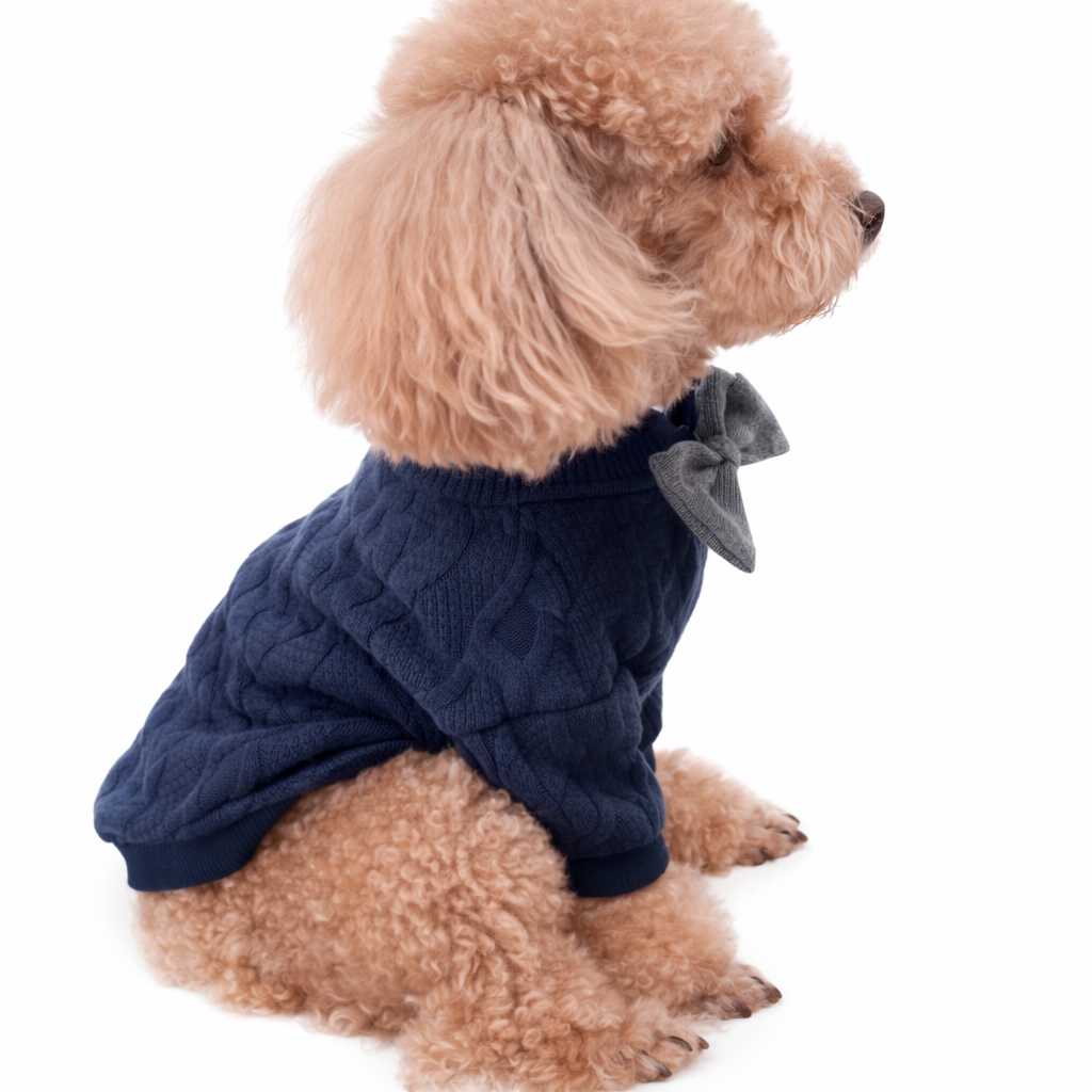 An elegant knit top in a classic navy tone, finished with a subtle bow detail at the neckline.