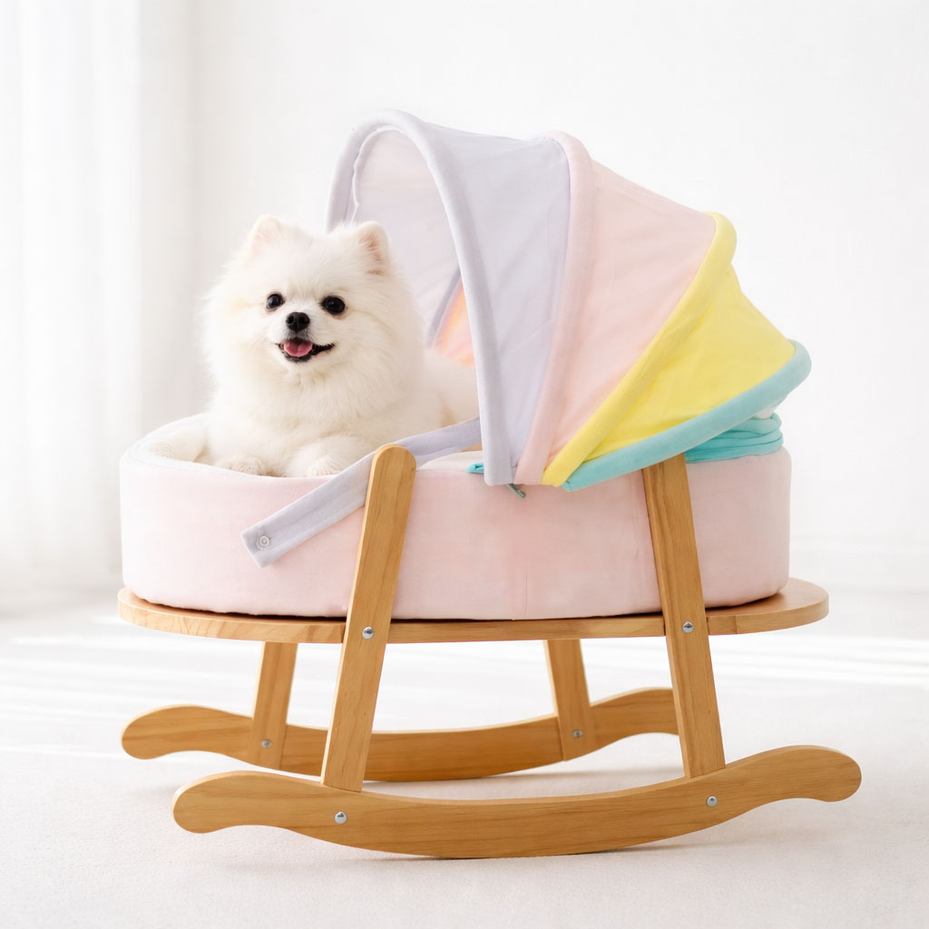 A gently rocking pet bed designed to provide comfort and a sense of security.