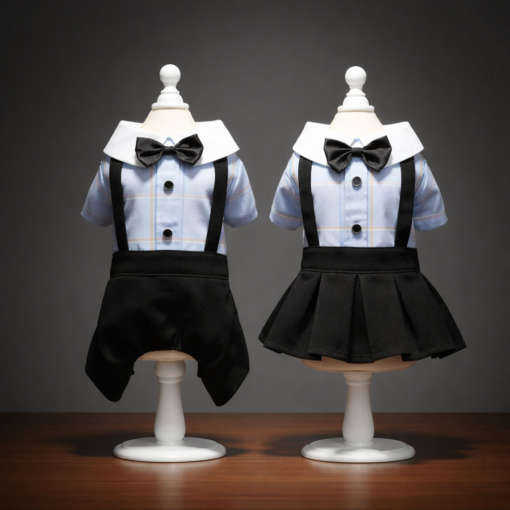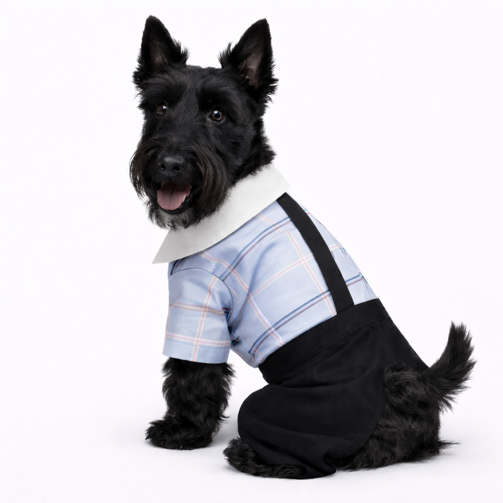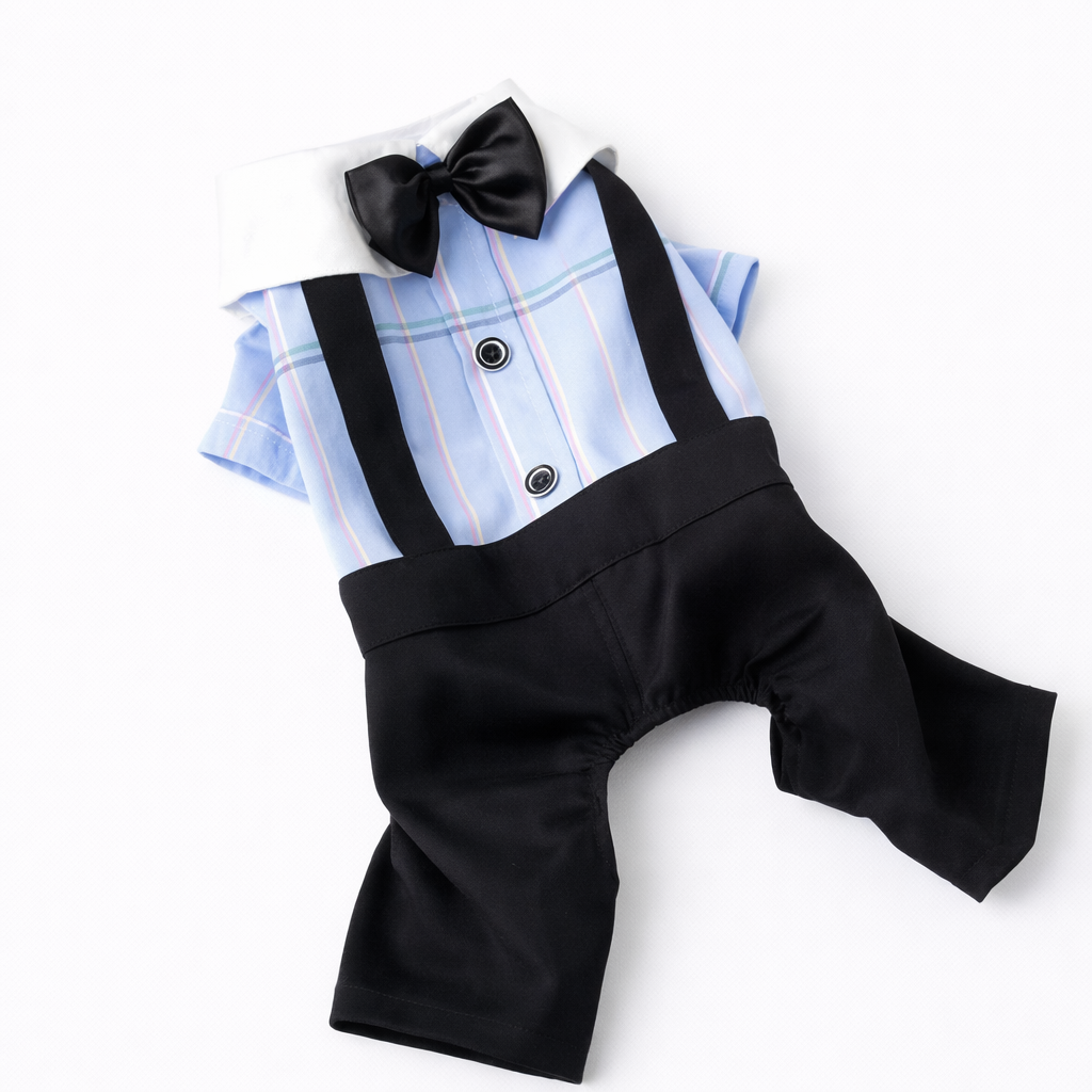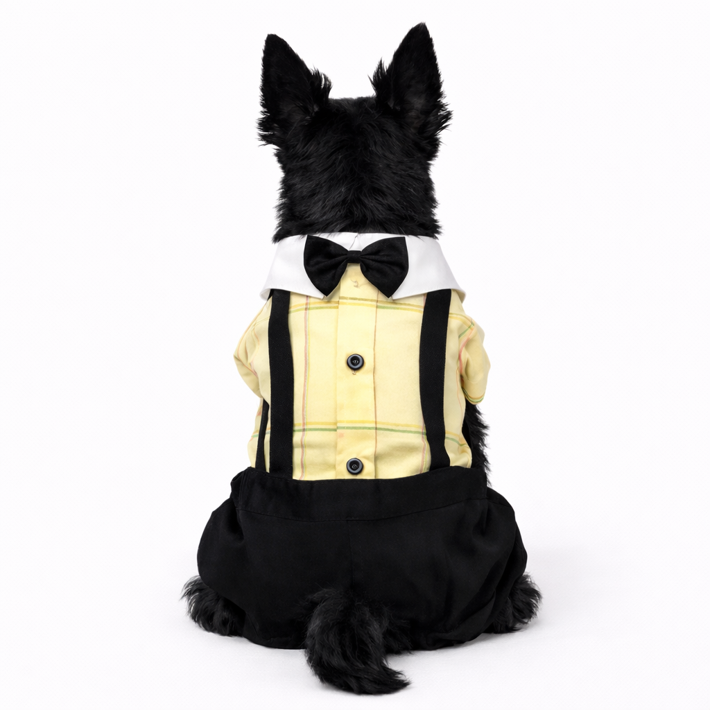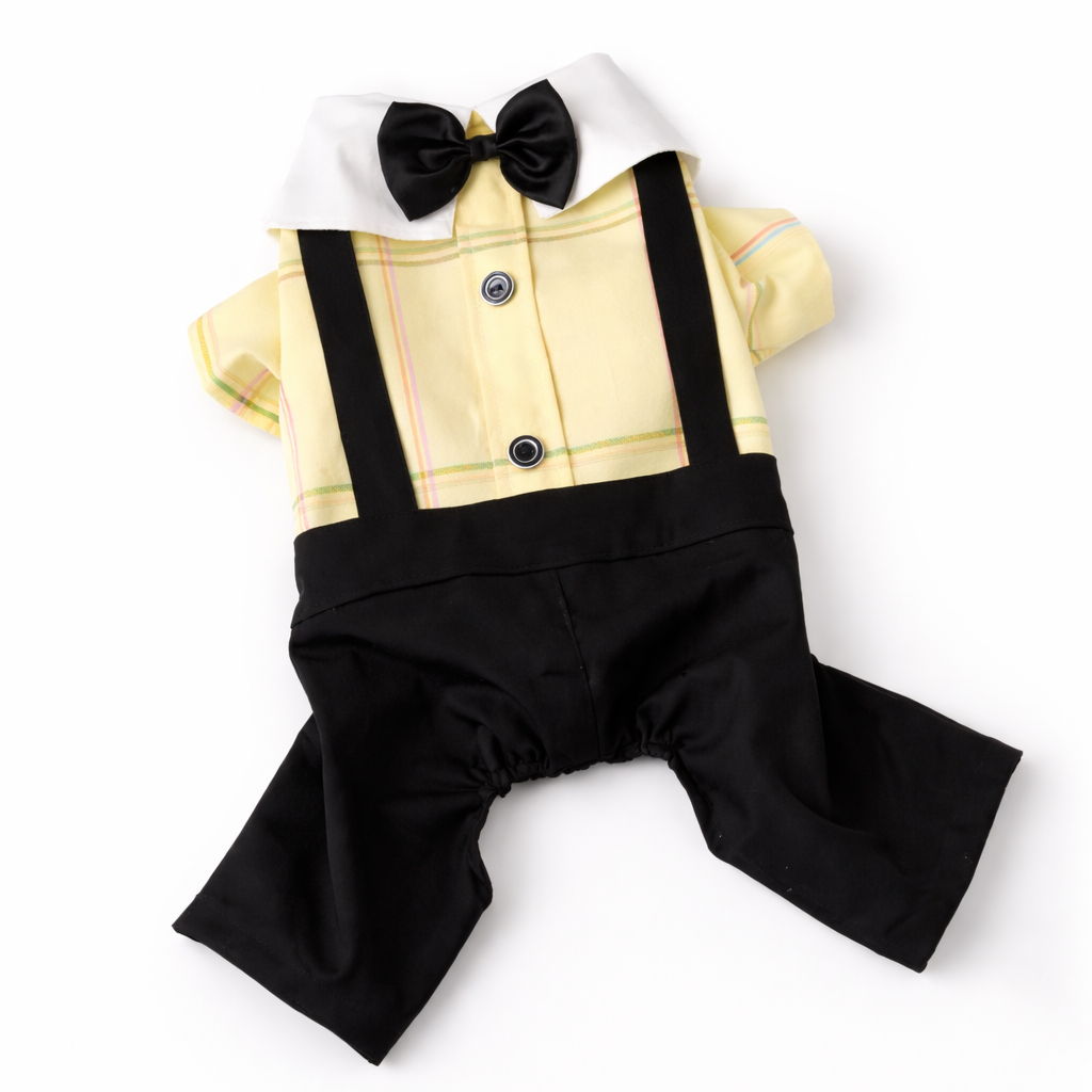 A charming formal dog outfit designed with built-in suspenders and a bowtie for an effortlessly dressed-up look.